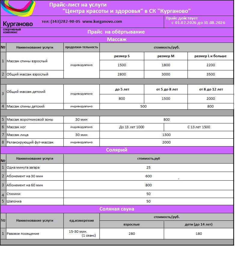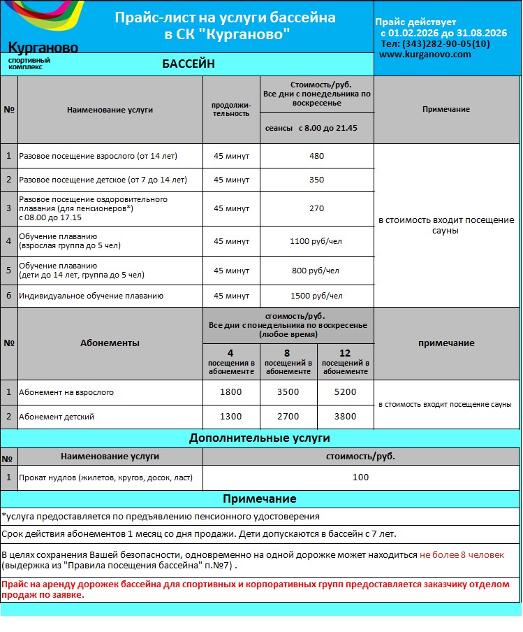 Дополнительно в подарок предоставляется сауна (15 минут)! Технологический перерыв в будние дни 13-15ч. кроме лета Справки по телефону: 8 (343) 282-90-05 | ||||
